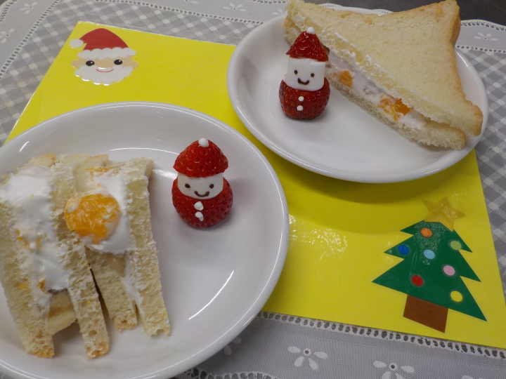 おやつはみかんとバナナのフルーツサンドとイチゴサンタさんでした!