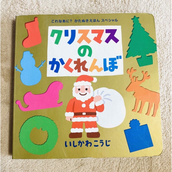 そのページの中にかくれんぼしているクリスマスツリー、靴下やサンタクロースをくりぬかれた型抜きのページをあてて遊びます。クリスマスを彩るアイテムが続々登場するので、発見するたびに気分も高まる楽しい絵本です。