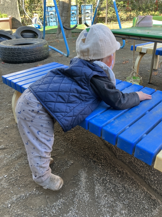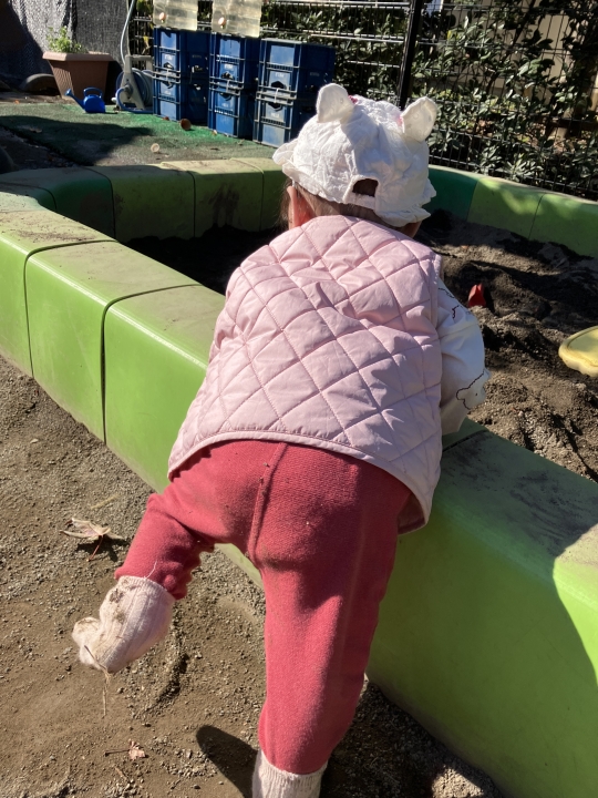 一人歩きやつかまり立ち、ずり這いやハイハイで進むなど一人ひとりがのびのびと園庭内で行きたいところへ探索していきます。